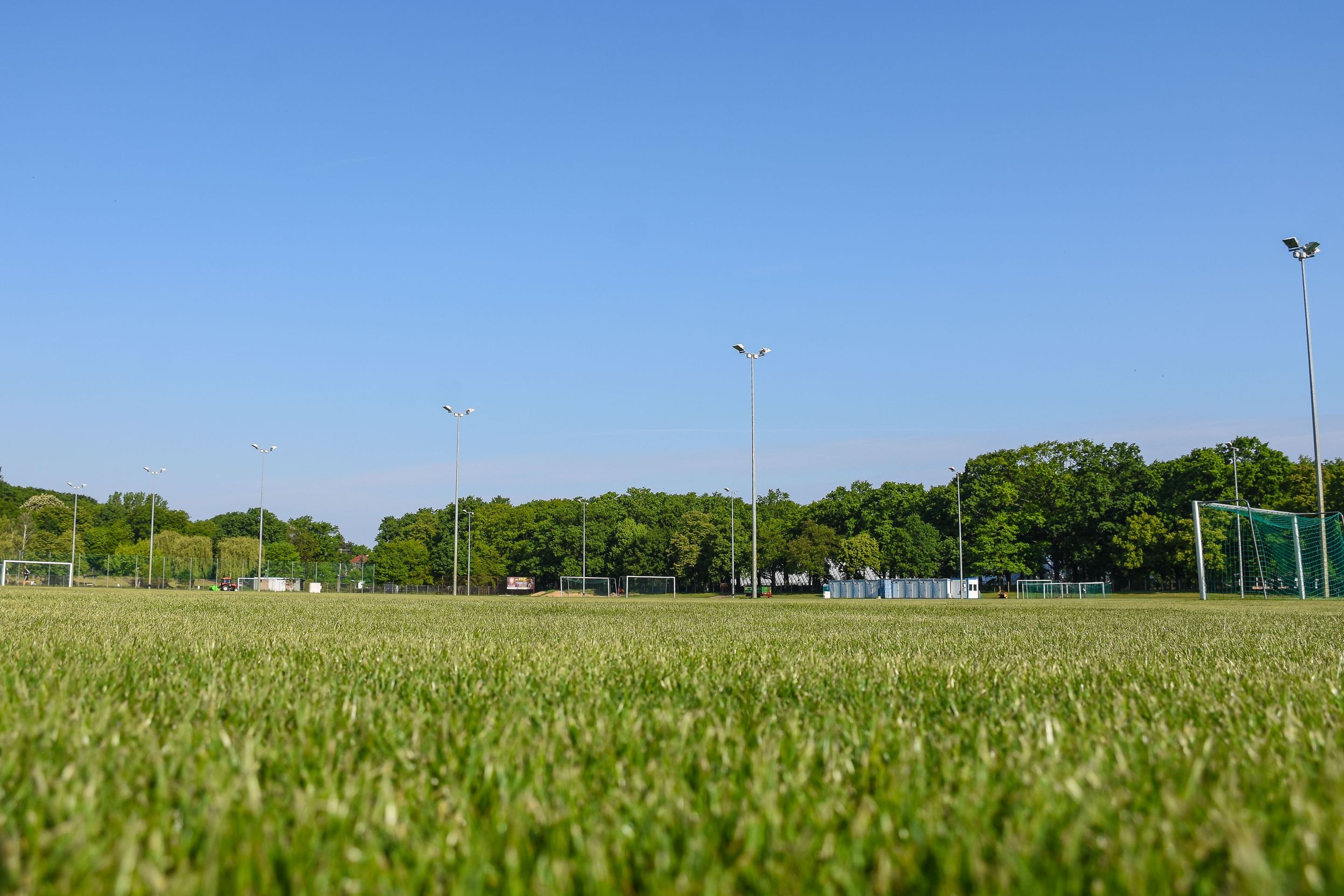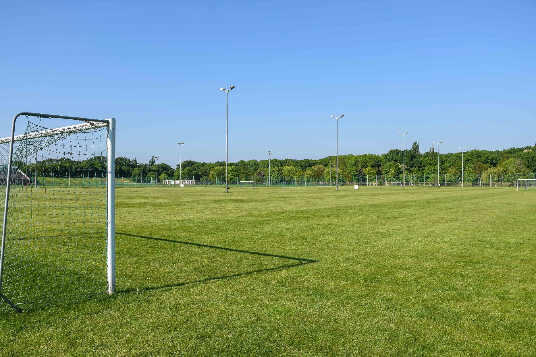 Siedem boisk trawiastych (dwa o wymiarach 105 x 70m., jedno o wymiarach 60 x 90m. z bramkami"piątkami" i cztery mini boiska o wymiarach 50 x 30m. z bramkami "piątkami",